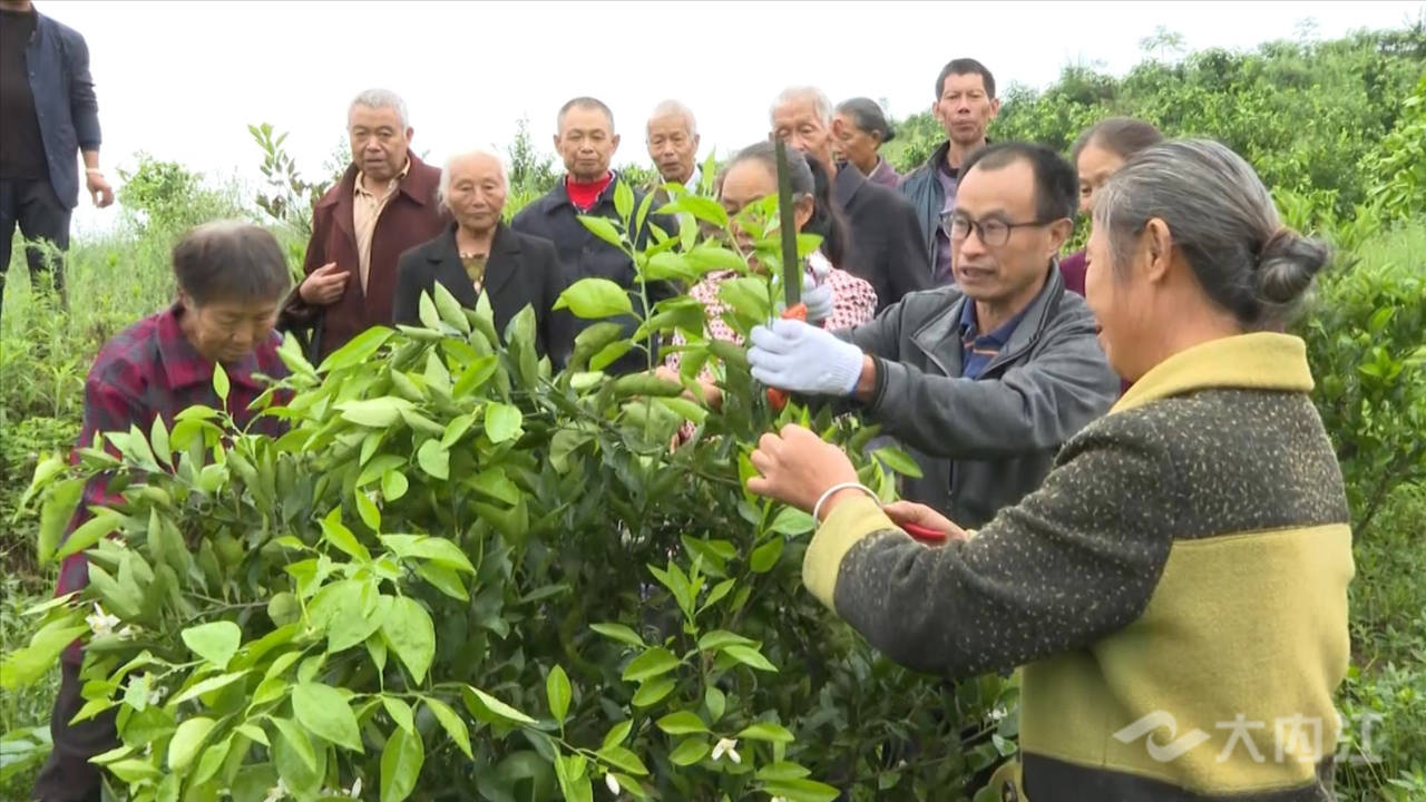 眼下正值血橙果实膨大转色期,在资中县明心寺镇宜古寺村,农技人员忙着向村民讲解果树管护的注意事项。