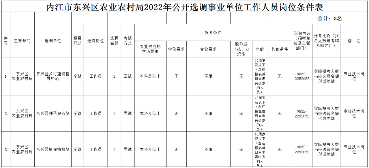 3. 符合本公告考聘岗位所需的其他具体条件及资格要求,详见《内江市东兴区农业农村局2022年公开选调事业单位工作人员岗位条件表》(附件1)