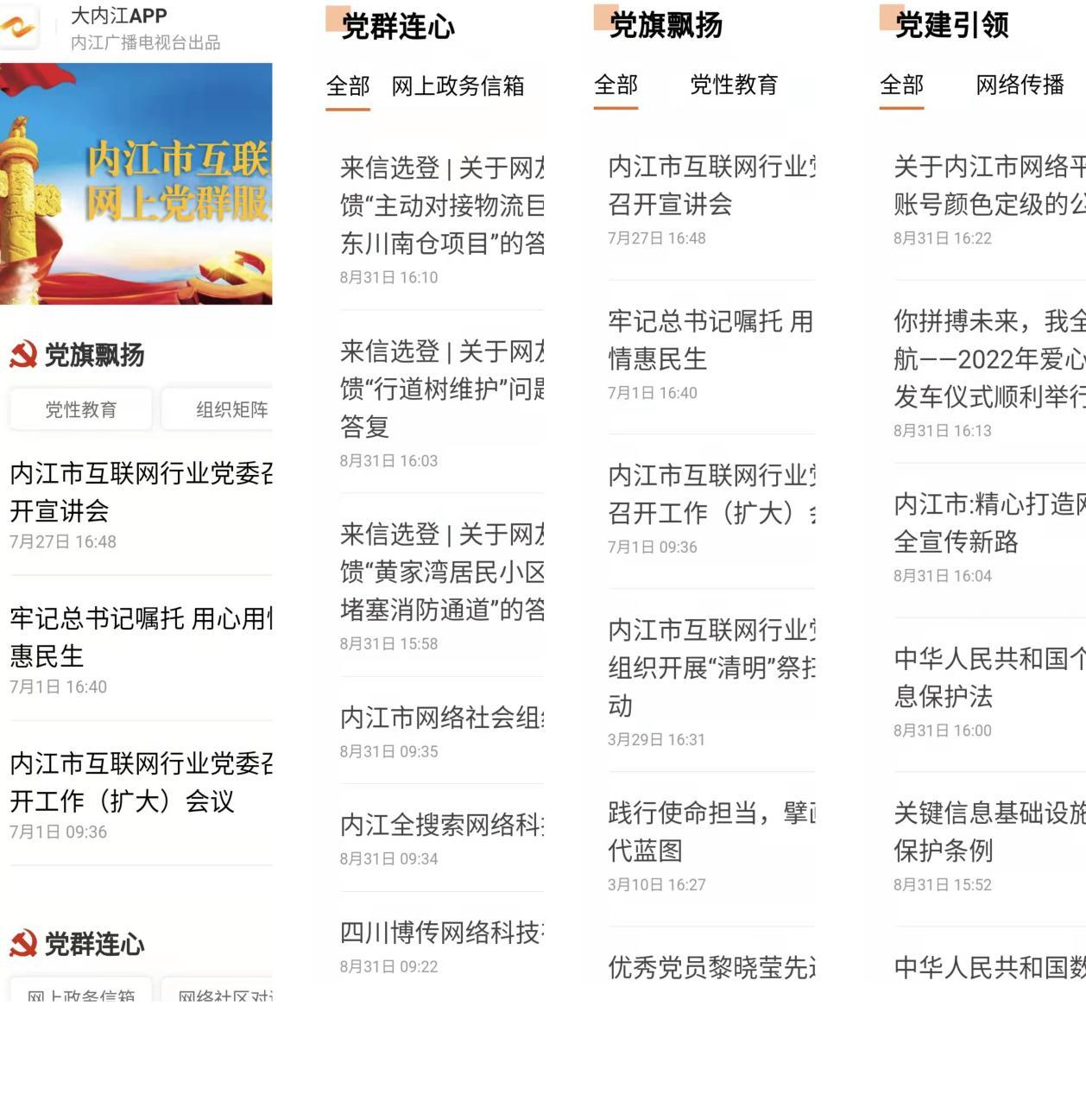 2022年7月,内江市互联网行业党委召开工作(扩大)会议,讨论市互联网行业网上党群服务中心建设方案。经过多方论证和修改完善,内江市互联网行业网上党群服务中心于9月5日正式上线。中心以“党旗飘扬”宣传普及党务知识、以“党群连心”畅通政企对话渠道、以“党建引领”推动企业健康发展。网上党群服务中心准确把握互联网行业发展特点,以“互联网+党建”形式加强互联网企业“党性教育”,是对非公有制企业党建工作的一次有益探索,解决了互联网企业党员教育学习、党组织活动开展、党建工作指导等具体问题,大大提升了互联网企业党组织创造力、凝聚力、战斗力。