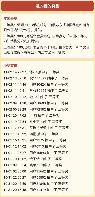 据了解,此次有奖知识竞答活动将持续到11月30日,市民朋友们可通过大内江APP内的链接参与活动,每人每天可答题2次,每次答对10道题便可参与抽奖,有机会获得荣耀70手机、300元中石油购物积分、100元文轩书店购书卡等奖品。截至2日晚上6点,已有超7000人参与活动 。
