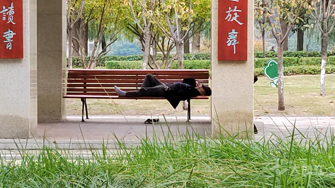 ▲大洲广场——遛狗不拴绳、市民躺卧公共座椅