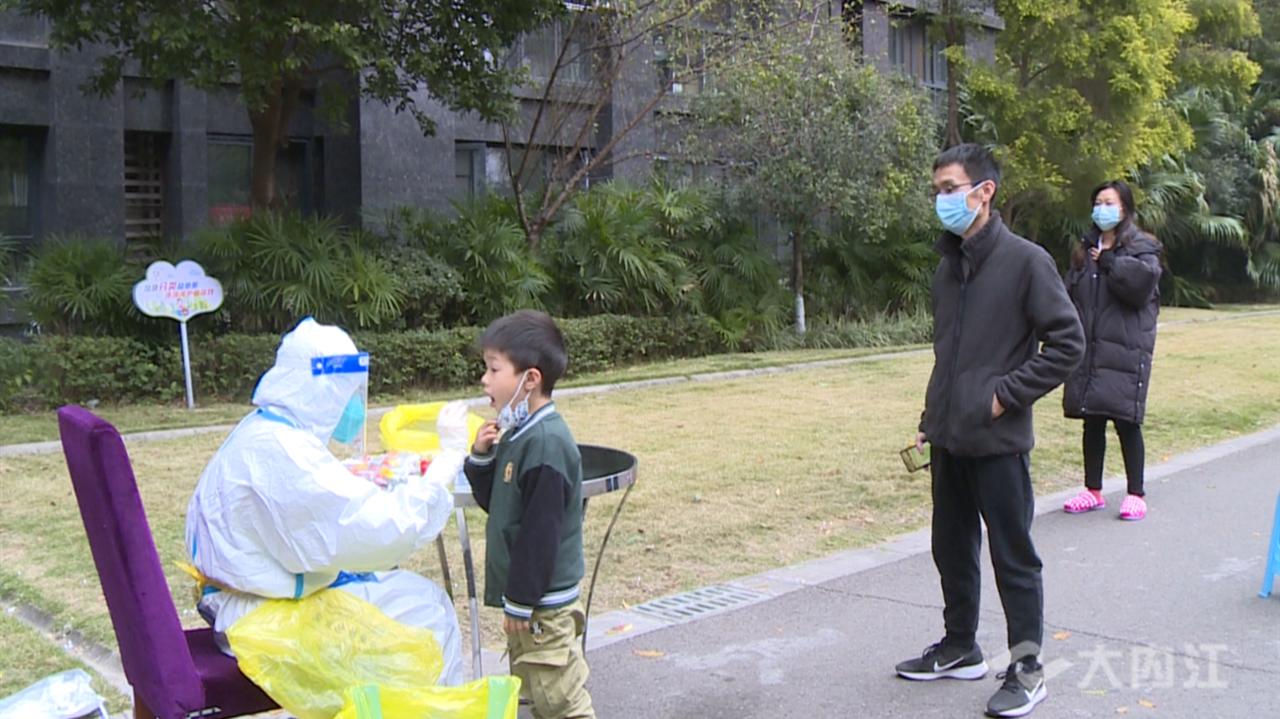 11月26日一大早,记者在东兴区龙湾半岛小区看到,居民们在党员志愿者的引导下有序排队接受核酸检测。