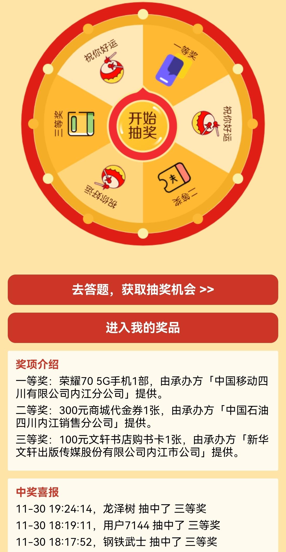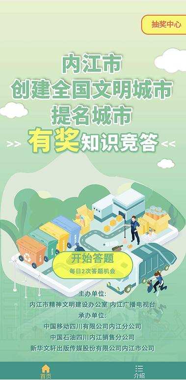 据了解,由内江市精神文明建设办公室、内江广播电视台主办,中国移动四川有限公司内江分公司、中国石油四川内江销售分公司、新华文轩出版传媒股份有限公司内江市公司承办的内江市创建全国文明城市提名城市有奖知识竞答,从10月31日一直持续到11月30日结束。在一个月活动期间,共有超2.8万名市民朋友通过大内江APP踊跃参与活动。其中,共中出一等奖3名、二等奖66名、三等奖184名。这种寓教于乐的知识传递模式,进一步加强了内江市民对创建文明城市应知应会知识的了解和掌握,营造出良好的创文氛围。