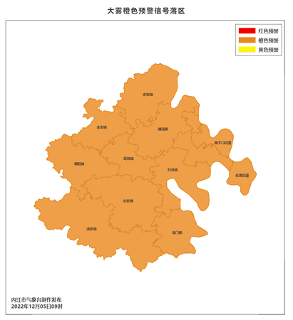 内江市气象台2022年12月05日09时02分发布大雾橙色预警信号:市中区城西街道、玉溪街道、城东街道、牌楼街道、乐贤街道、史家镇、全安镇、朝阳镇、永安镇、凌家镇、龙门镇、白马镇和经开区壕子口街道、交通镇、靖民镇等乡镇(街道)6小时内可能出现能见度小于200米的雾或者已经出现能见度小于200米、大于等于50米的雾并将持续。请高速公路、轮渡码头等加强交通管理和调度指挥,驾驶人员控制车船的行进速度,确保安全;不适宜户外锻炼。