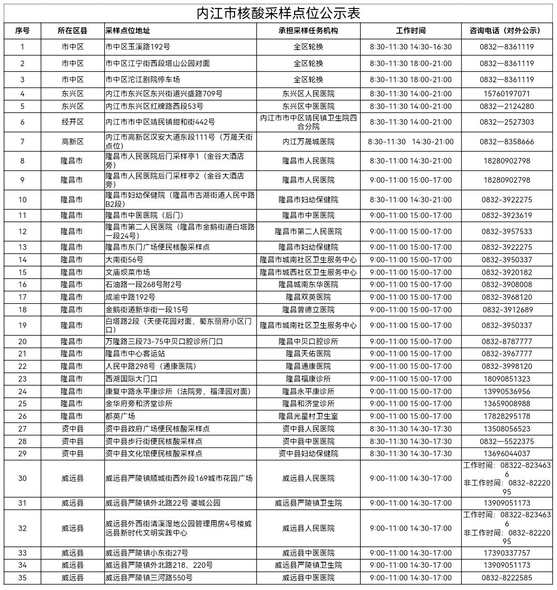 健康内江官微公布内江市核酸采样点位公示表,详细点位公布如下: