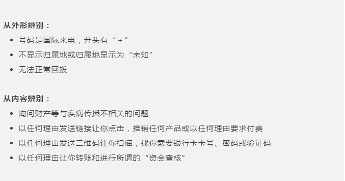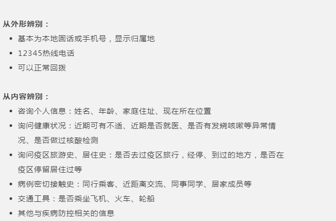 特别注意:接到电话后,流调人员会先表明自己的身份(民警/疾控工作人员/社区工作者等)。流调人员不会询问你的资产情况,这是识破骗局的关键点。