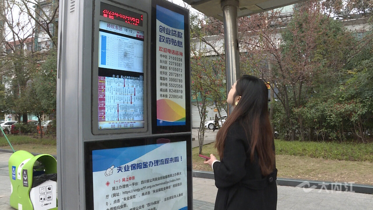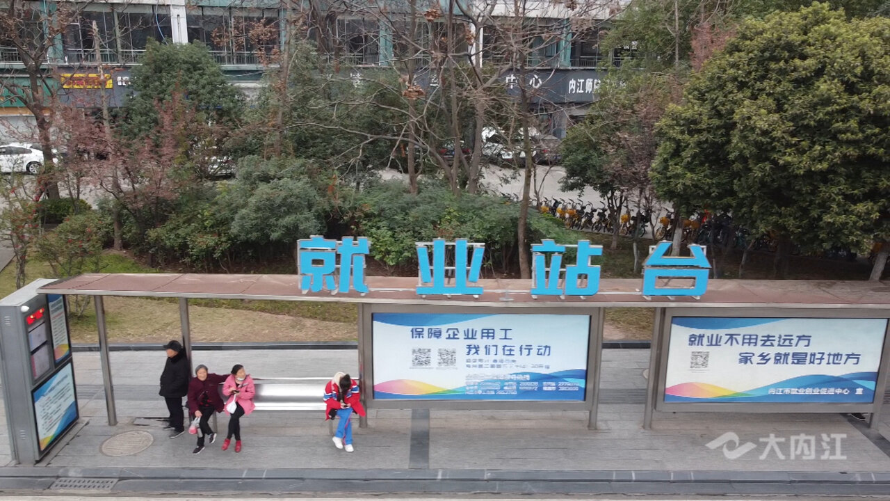 车站正面广告换成了“就业不用去远方,家乡就是好地方”的宣传标语,以及内江各地企业用工保障服务热线号码、直播带岗视频直播间、服务企业用工手册、内江就业服务微信公众号二维码等信息,市民手机扫描这些二维码就能获取更多就业信息。此外该公交站侧面还有“高校毕业生服务热线”、“失业保险金办理流程”等内容。