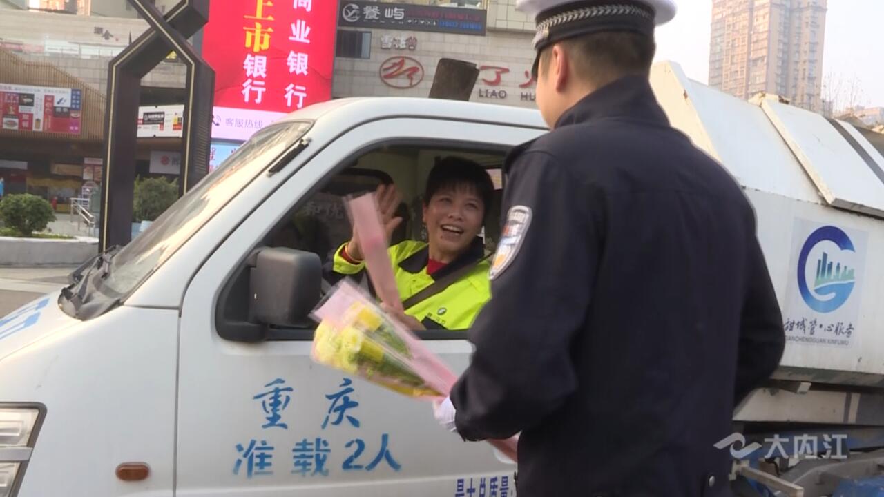 当天,执勤民警还为城区部分路口执勤的女交警、女性交通文明劝导员,以及车管服务大厅在岗的女同胞送去鲜花和节日祝福。