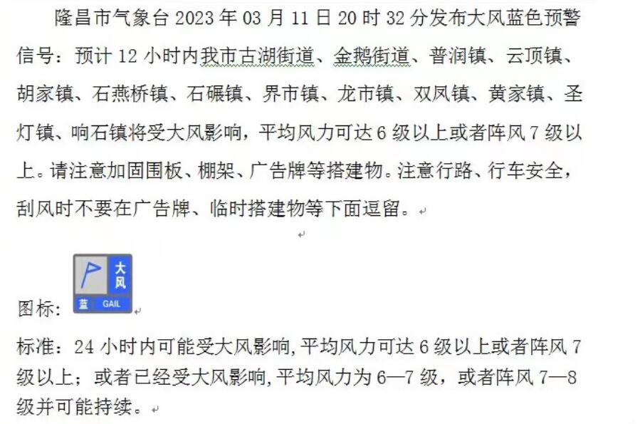时间:2023-03-11 20:46:12 来源:内江市气象台 东兴区气象台 隆昌市气象台 资中县气象台 威远县气象台刚刚,内江多地发布大风蓝色预警信号,详情如下: