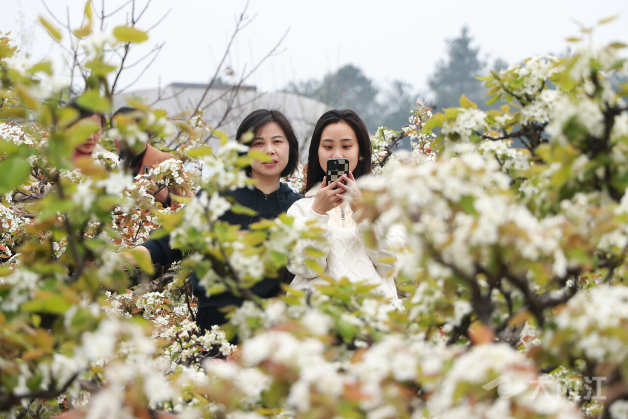 步入梨园,只见梨花吐蕊,一团团、一簇簇竞相盛开,幽深的梨花芳香、新鲜的泥土气息沁人心肺。游人置身梨园之中赏春景、拍美照、与花争俏,绘就一幅别样的春日游园图。
