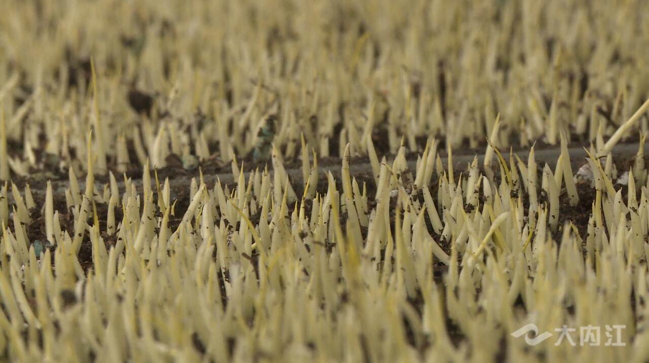 近日,记者在位于东兴区田家镇的内江长江现代农业园区育秧中心看到,一粒粒稻谷在经过拌种、上盘、盖土等工序后,顺着履带进入田间,经人工覆膜后静待发芽。在大棚架上,不少水稻苗已冒出了新芽。