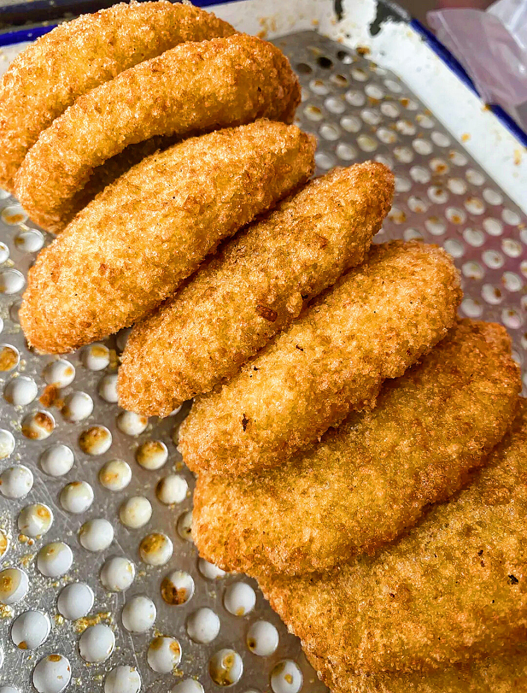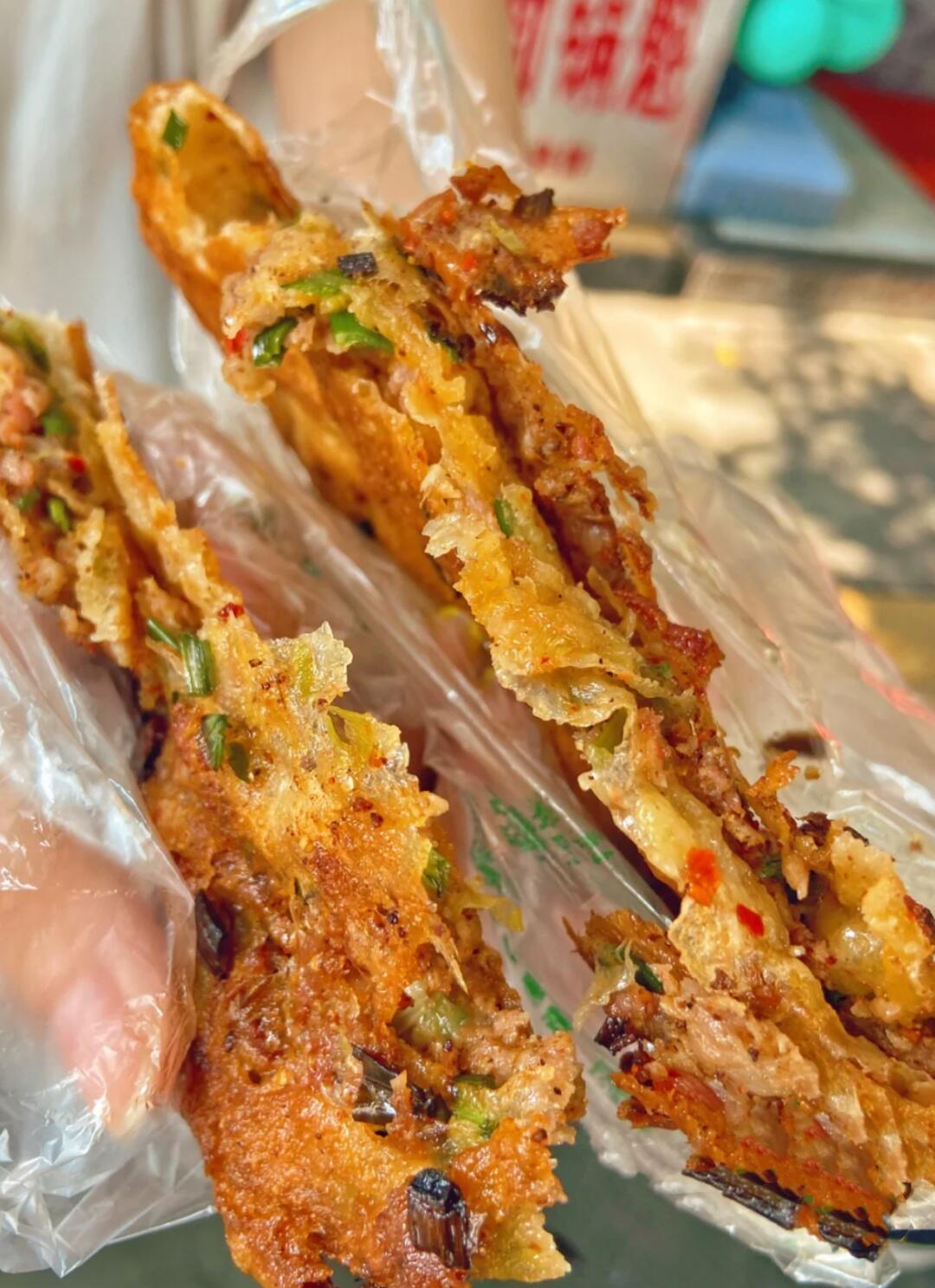 超大的糯米团裹上绿豆馅,再加上盐和花椒,等压平后放入油锅中去油炸,外皮变得酥脆金黄后即刻捞起。一口咬下,外酥里软、油而不腻,咸甜适宜,配上一碗豆浆刚刚好。