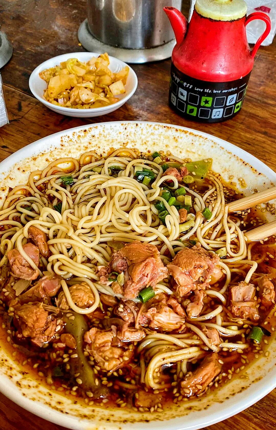 浇头已经很够味了,不过当的细碱面从大锅里捞起后,还得加上猪油、芝麻和油辣子、葱花和菜叶,将一碗的红绿拌匀后,香味直接翻倍,一口接一口根本停不下来。