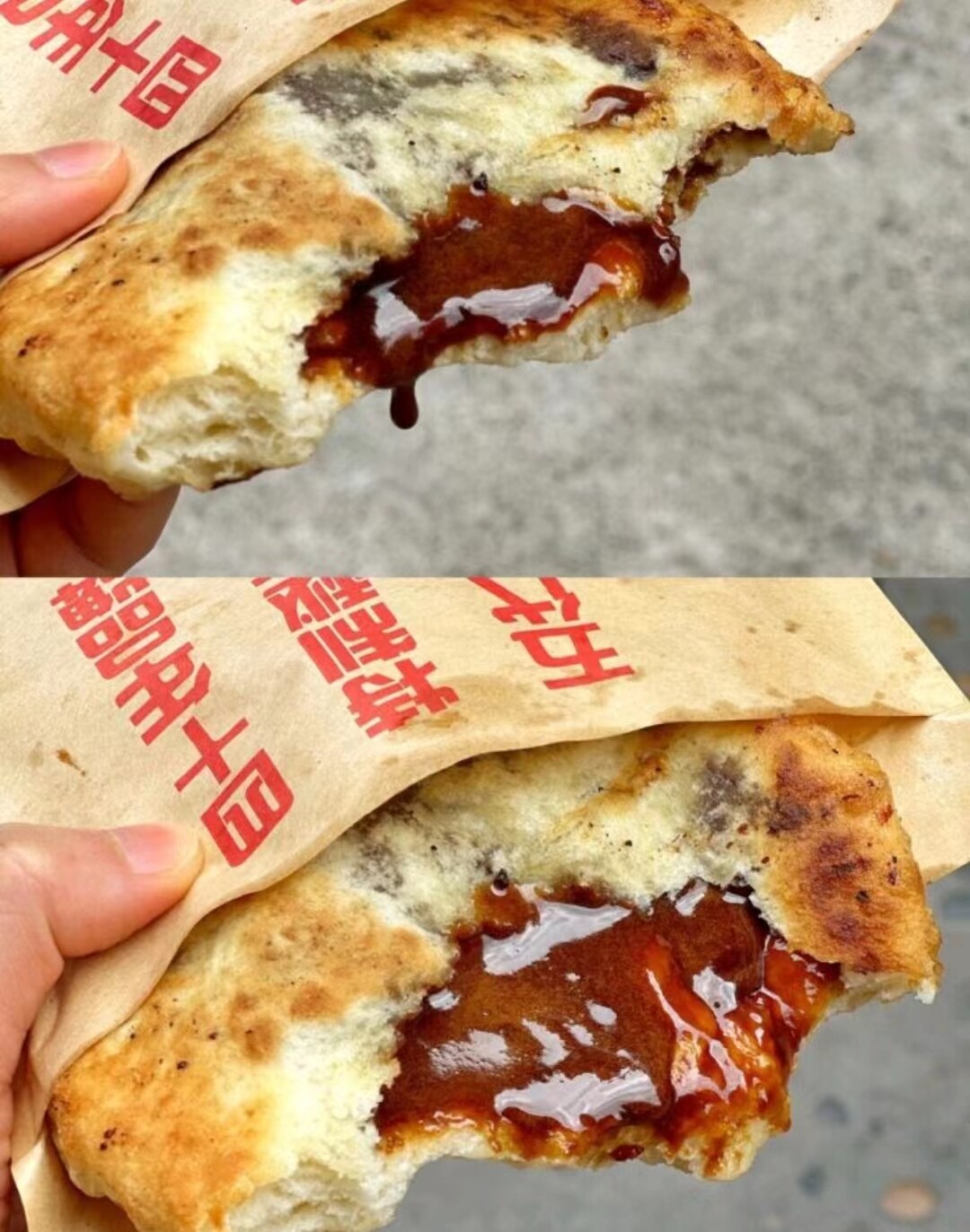 他家的锅盔每天都是现打的,吃起来超级筋道,咬下去的瞬间,红糖汁儿就直接流出来了。