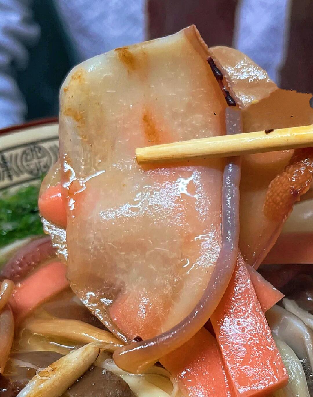 这碗面的亮点就在于汤底和浇头,鸡鸭加上大棒骨熬出来的浓汤打底,然后铺上脆爽的大鱿鱼,放入黄花、木耳、煎蛋等配菜,最后再淋上一勺酱肉,汤、面、菜混合着唆下,超级鲜美。