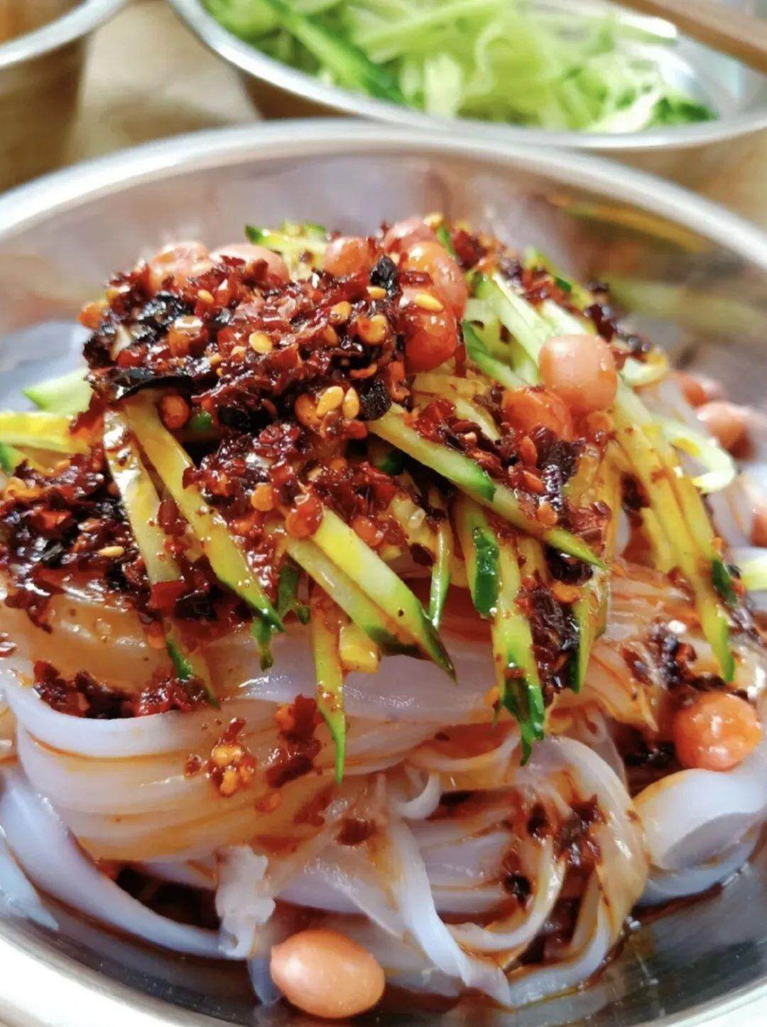 很多凉粉店每天开店的时候就会把凉粉现做出来,客人来了,就加上小米辣、醋、蒜末、花生,淋上辣油,一分钟不到就能端上桌。