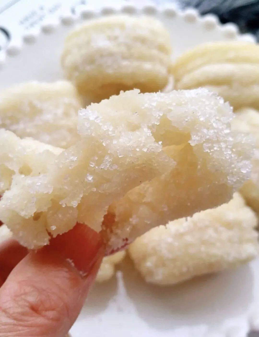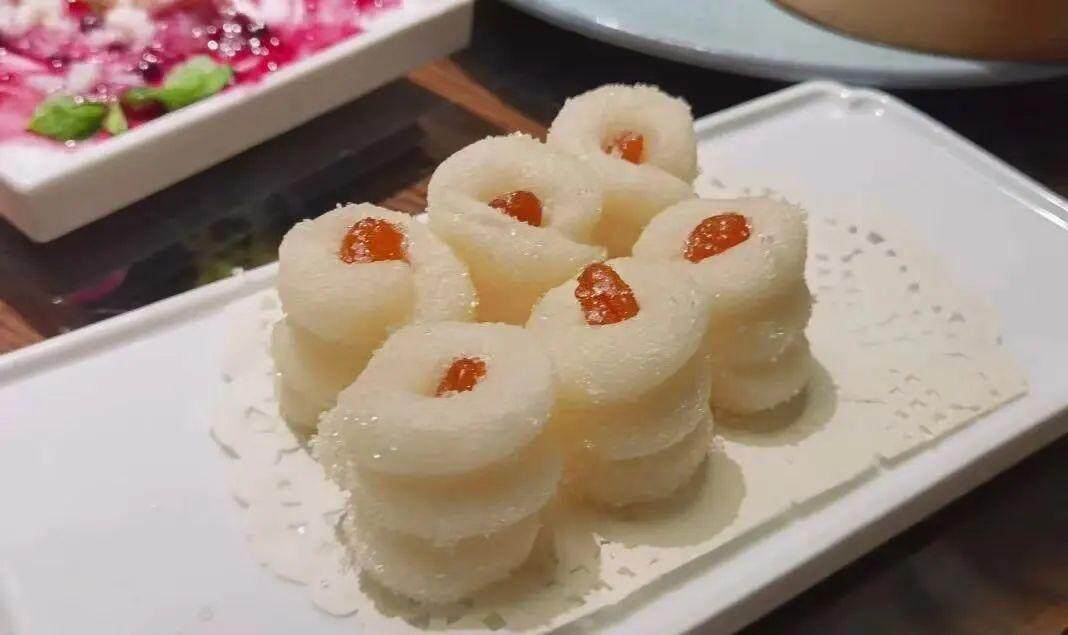 内江盛产甘蔗,所以这里的白砂糖有一种天然的清香感,将白糖直接洒在用大米蒸熟的白糕表面,再放上一颗蜜饯,瞧上去晶莹剔透。