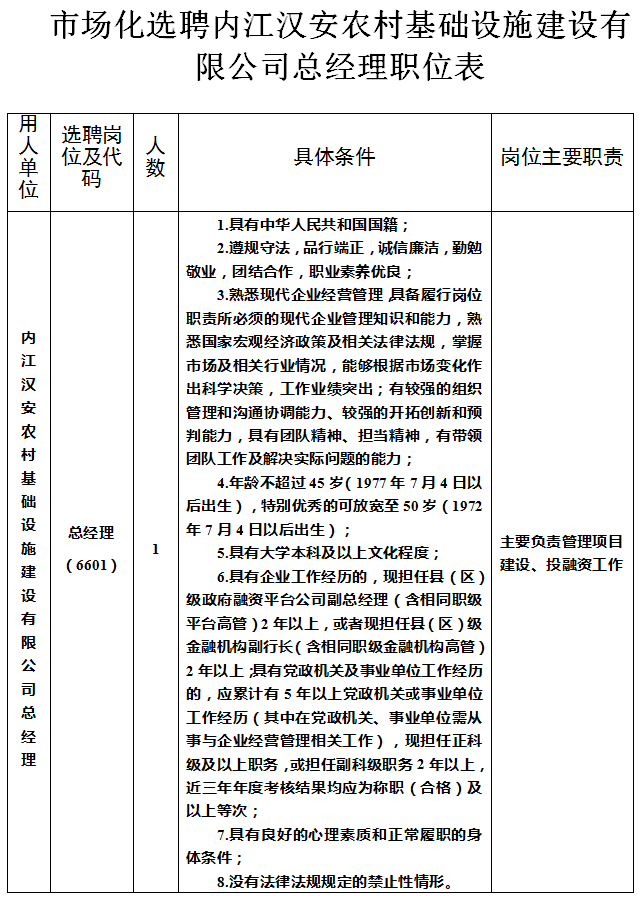 为推动区管国有企业高质量发展,进一步优化区管国有企业领导班子结构,积极稳妥推进国有企业职业经理人队伍建设,广开视野选拔优秀专业的高级管理人才,经研究决定,面向社会市场化选聘内江汉安农村基础设施建设有限公司总经理1名。现将有关事项公告如下: