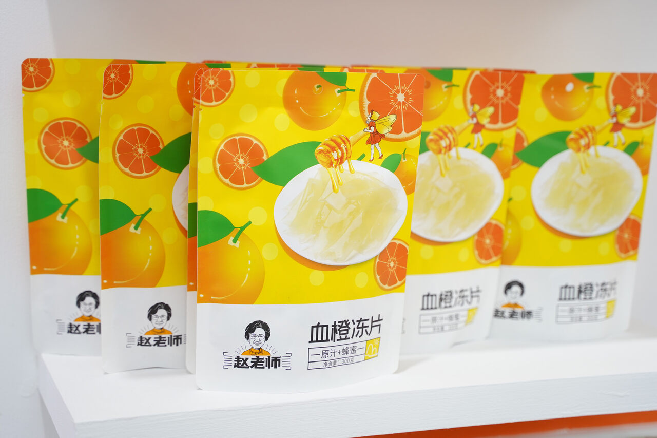 内江综合展示馆主色调灵感源自资中血橙,“内江橙”温暖舒适、充满力量。四川紫晨农业科技有限公司带来资中血橙和血橙酒、冻干片等系列周边产品。