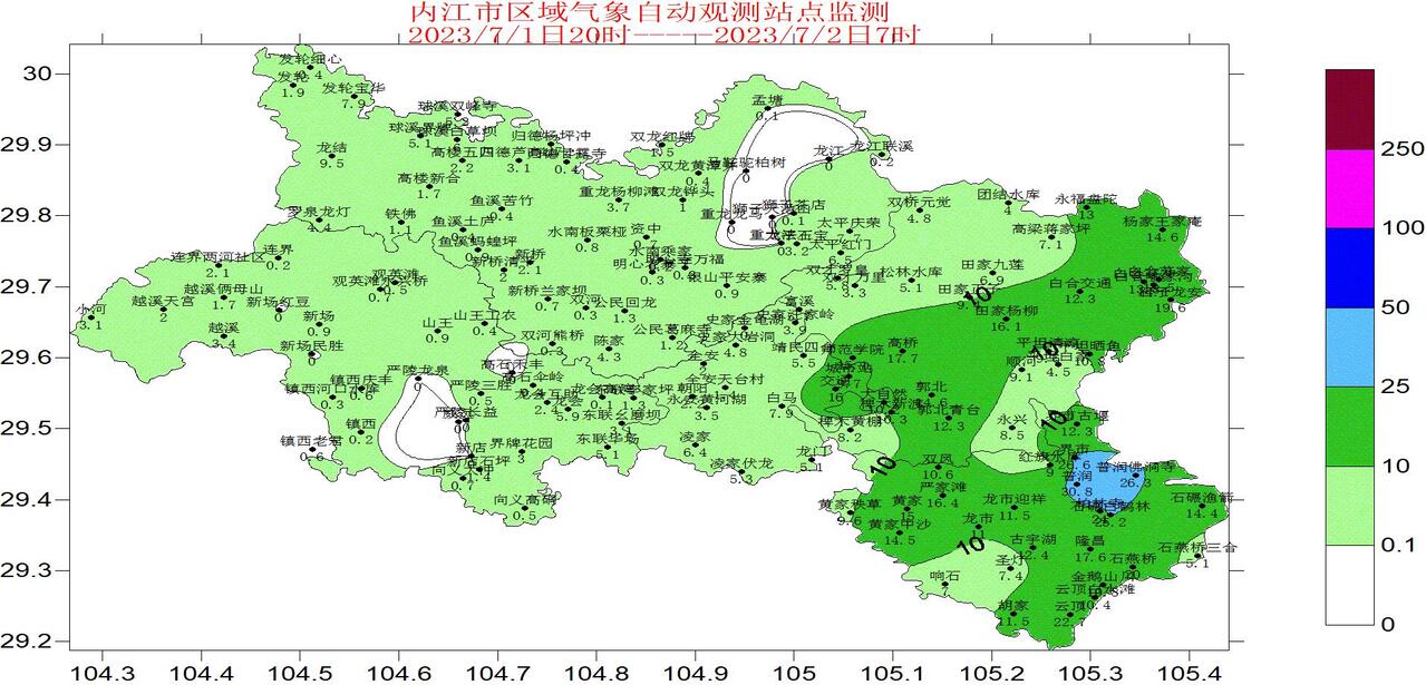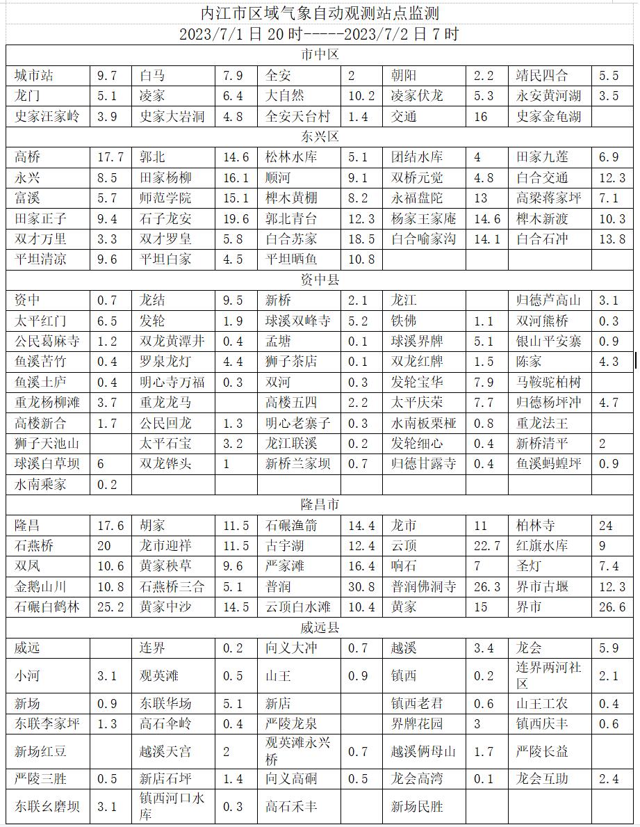 7月1日20时至2日07时,我市普降小雨,东部部分地方中雨,隆昌市个别地方下了大雨,最大雨量出现在隆昌市普润,为30.8毫米(见附表)。全市148个观测站大雨站4个,中雨站32个,小雨站99个。