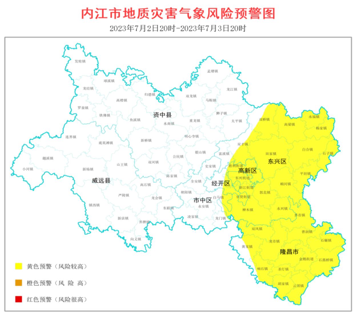 时间:2023-07-02 19:38:29 来源:内江市地质灾害指挥部办公室7月2日17时, 内江市地质灾害指挥部办公室发布地质灾害气象风险预警结果,详情如下: