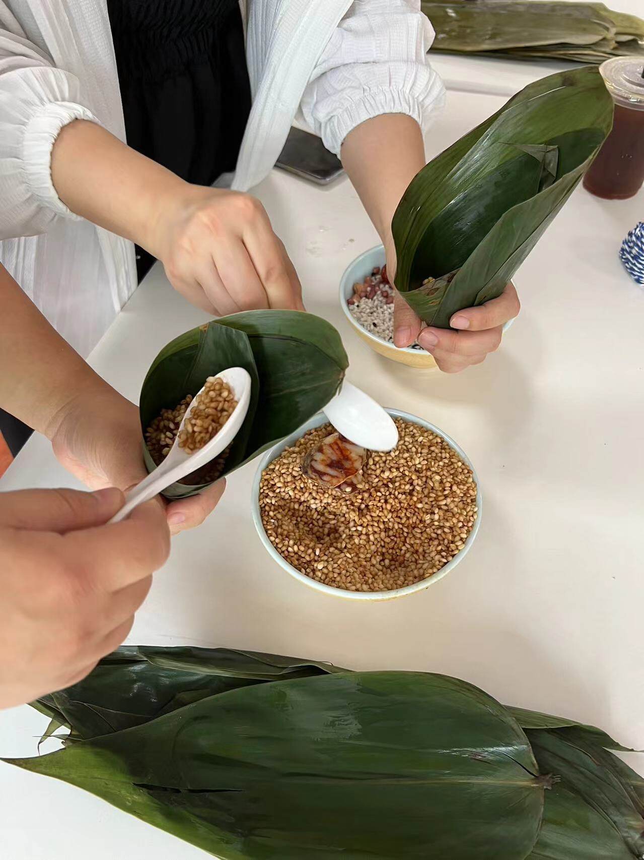 一年一端午、一岁一安康。在手工老师的简单教学后,趣味包粽子活动正式开始,捋粽叶、做漏斗、填糯米、压紧实、封口、扎捆。员工们相互学习、相互探讨,从陌生到熟悉、从匆忙到熟练,很快掌握了包粽子的技巧,不断精进手中粽子的造型,活动现场一片欢声笑语、其乐融融。