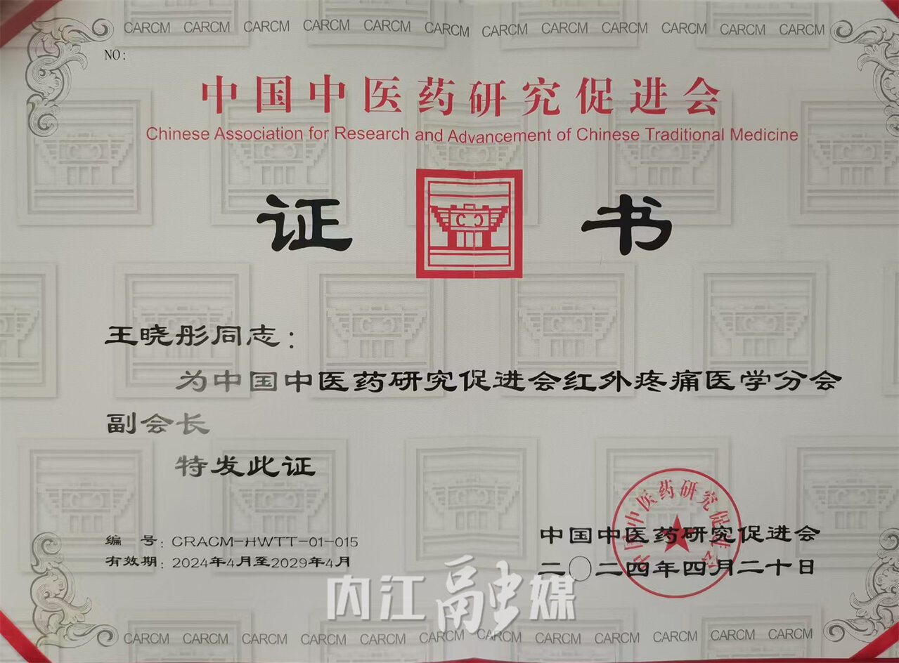 ▲当选为中国中医药研究促进会红外疼痛医学分会副会长