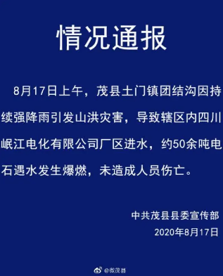 2020年8月17日下午,四川阿坝州茂县县委宣传部官方微博发布情况通报称,茂县土门镇四川岷江电化有限公司因山洪进水,50余吨电石遇水发生爆燃,幸未造成人员伤亡。