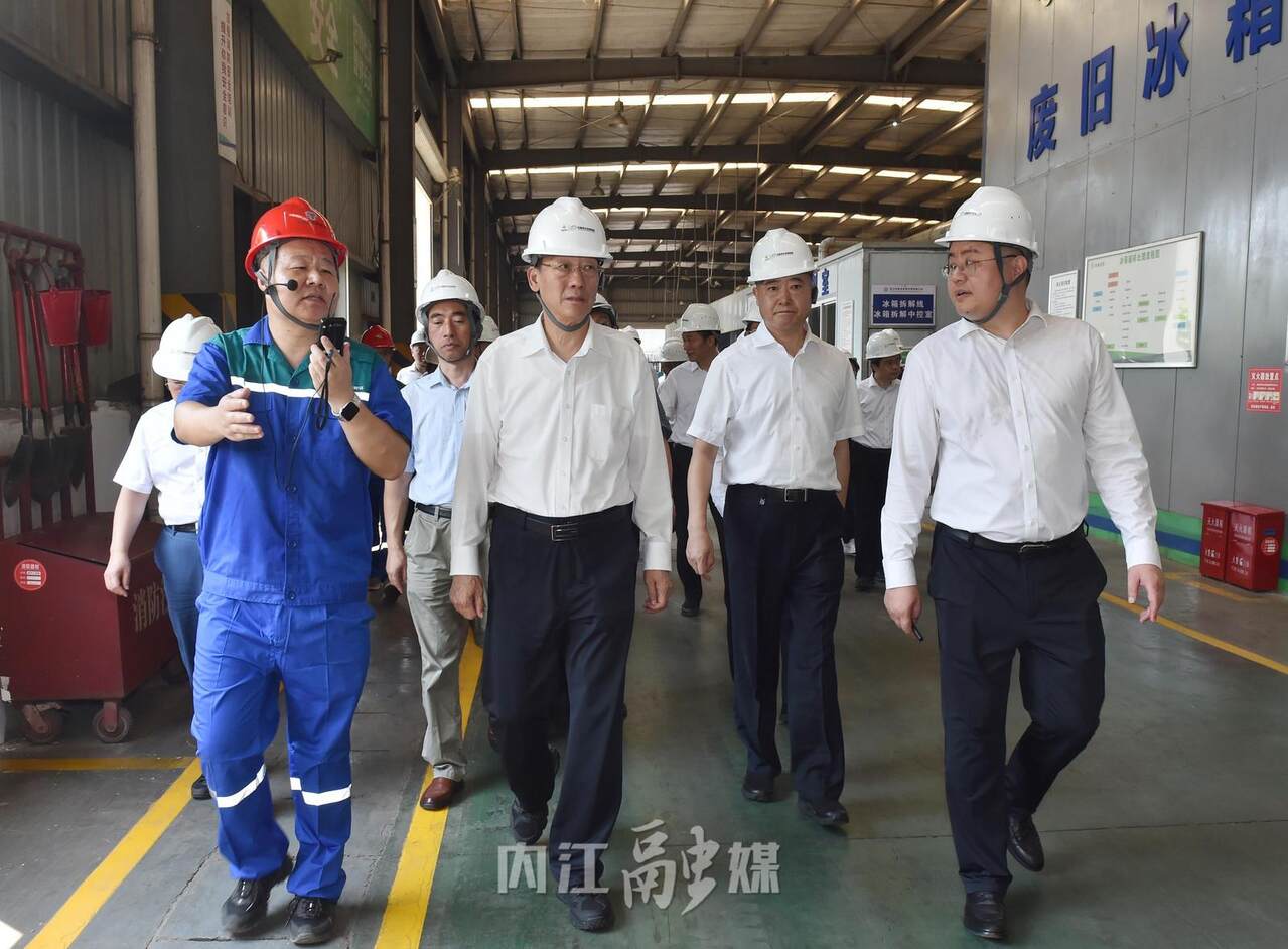 在西南再生资源产业园,韩立平一行深入中再生内江基地卸货平台、家电拆解车间等地,详细了解园区建设、企业生产经营及产线布局、生产工艺等情况,并询问发展中面临的困难和问题。在随后召开的座谈会上,韩立平一行听取了有关工作汇报,就解决园区及企业当前发展中面临的问题提出要求。他指出,要严格按照环保督察工作要求,切实抓好园区突出环境问题整改,确保在规定时间内整改到位。全面排查园区运营过程中存在的安全及消防隐患,对已排查出的各类突出隐患立即开展整改,确保园区安全、健康运行。突出“快”字,紧扣“新”字,推动存量闲置土地和闲置厂房开发利用,着力提升再生资源高值化利用、绿色低碳循环发展水平。