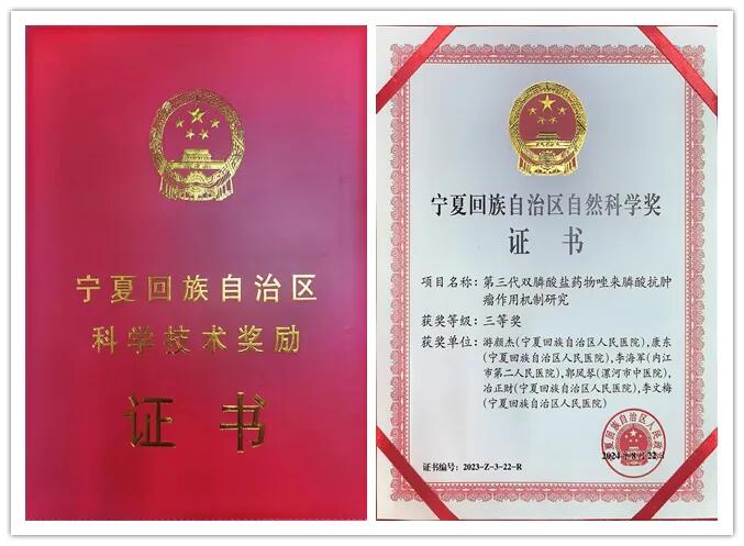 近日,宁夏回族自治区人民政府印发《关于2023年度自治区科学技术奖励的决定》(宁政发〔2024〕24号),内江市第二人民医院肿瘤二科党支部书记、副主任李海军博士作为第三完成人参与项目《第三代双膦酸盐药物唑来膦酸抗肿瘤作用机制研究》荣获自然科学奖三等奖。