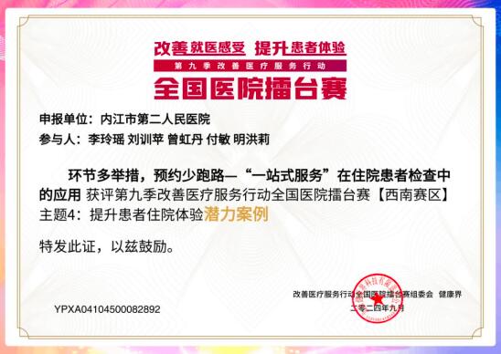 第四项:心血管内科团队选送的《环节多举措,预约少跑路—“一站式服务”在住院患者检查中的应用》案例,在“提升患者住院体验”主题中获“潜力案例”。