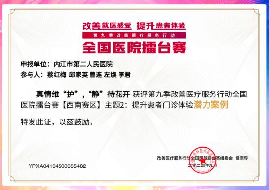9月13日至14日,由国家卫生健康委医政司指导,健康界主办,重庆医科大学附属第一医院承办的第九季“改善医疗服务行动”全国医院擂台赛西南区域赛在重庆落下帷幕。据悉,全国医院擂台赛经过9季的沉淀,本赛季更是吸引到全国近千家医院火热参与。擂台赛共设置10个主题,分五个赛区,全国各医疗单位共报送4896个案例,其中西南赛区共计报送 643个案例,经过激烈的角逐,在本季全国医院擂台赛西南区域赛中,内江市第二人民医院斩获6个奖项:1个案例突出重围以第一名成绩成功晋级全国总决赛,2个案例获区域赛“杰出案例”,3个案例获“潜力案例”。