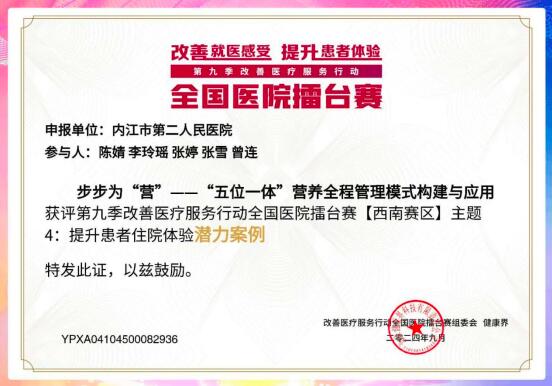 第六项:护理部联合营养科团队选送的《步步为“营”——“五位一体”营养全程管理模式构建与应用》案例,在“提升患者住院体验”主题中获“潜力案例”。