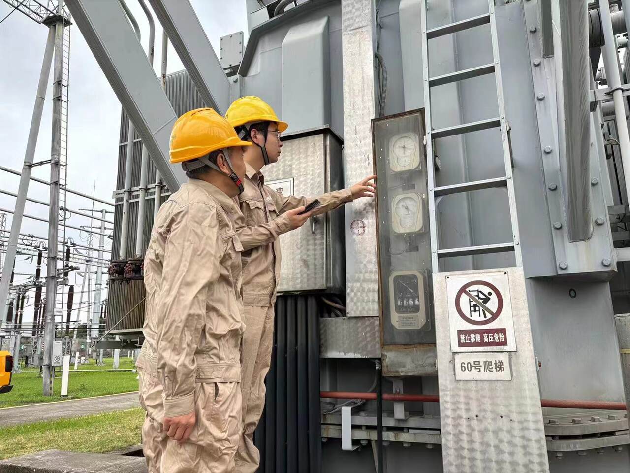 “1号主变压器套管油位正常……”10月1日,国网内江供电公司高压分公司变电运维人员陈则宇和张云在220千伏金鹅变电站开展国庆专项特殊巡视,重点对断路器气压、设备油位进行检查,根据油位温度曲线各项历史数据等分析设备运行状况。