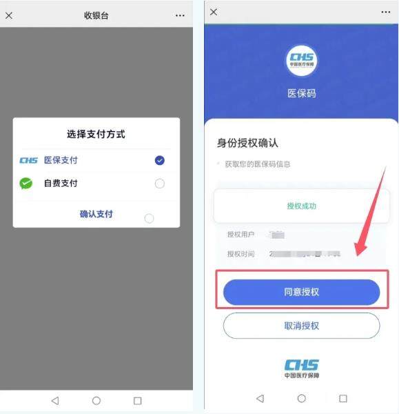 点击“立即支付”后,会弹出“选择支付方式”,分别是“医保支付”和“自费支付”,医保报销患者可选择“医保支付”进行支付。并根据缴费提示选择医保“同意授权”。