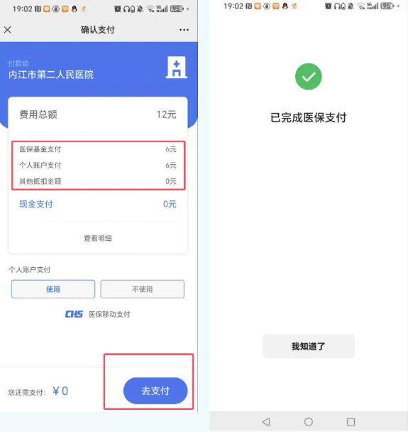 根据缴费提示页面,医保会自动算出本次缴费的医保报销情况,即“医保基金支付”、“个人账户支付”、“其他抵扣金额”等费用支付情况展示。点击“去支付”完成支付。