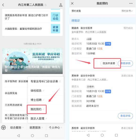 在医院微信公众号“个人中心”,点击“我的预约”找到已经预约成功的单子,选择“取消并退费”完成缴费退费,退费金额会按照缴费路径原路径返还。