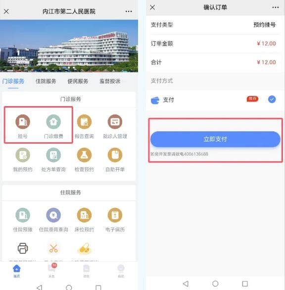 选择“挂号”或者“缴费”,并按照操作提示到支付界面,点击立即支付。