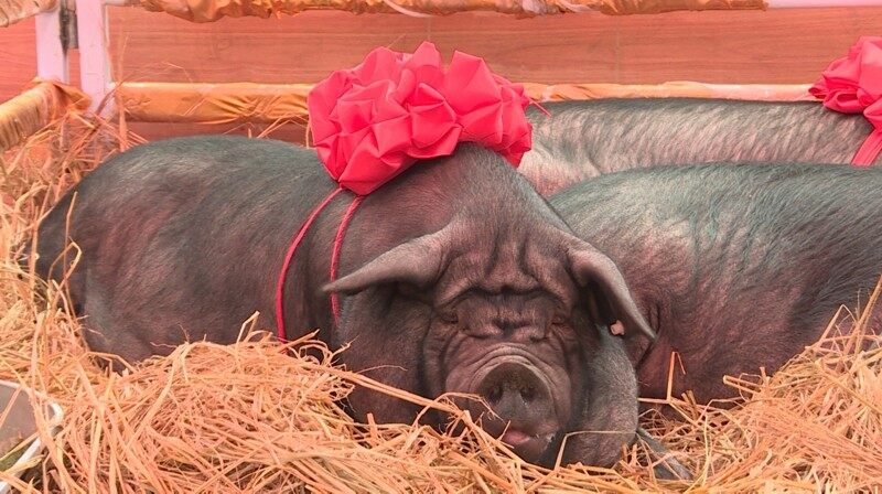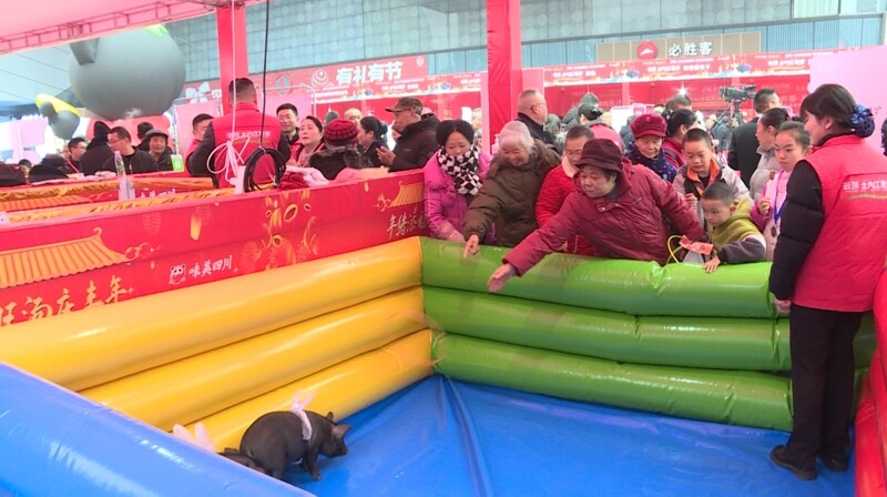 活动现场最吸引人的则是年猪巡游——总重超过1000斤的两头“猪王”一入场,立刻吸引了众多市民围观拍照,锣鼓声中,头戴大红花、身系红绸的“猪王”由壮汉抬着开始巡游,象征丰收和喜庆、寓意来年红红火火。