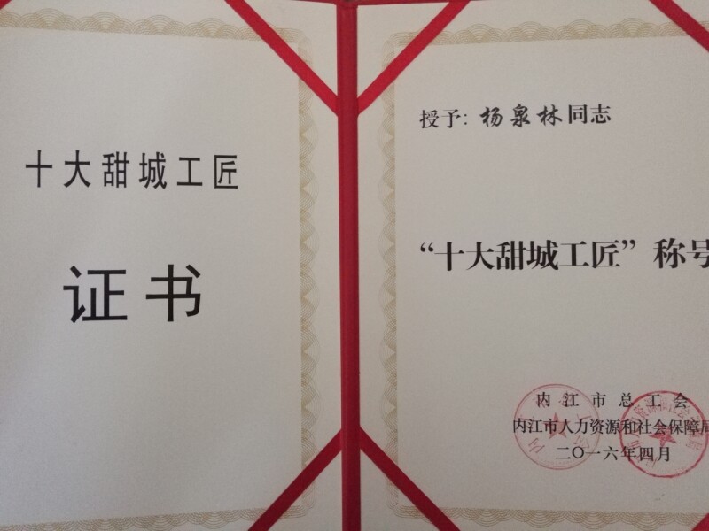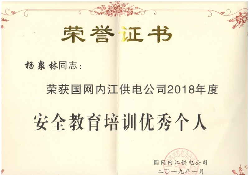 杨泉林还参与了“农电安全生产技术支持系统”和“农电标准化生产管理系统”的开发、测试工作,先后荣获内江市“五一劳动奖章”、“十大甜城工匠”、内江“践行十爱 德耀甜城”爱学习典型人物、“国家电网公司农网营销服务岗位技术能手”等荣誉。