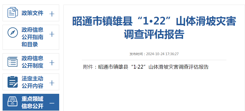 调查认定,昭通市镇雄县“1·22”山体滑坡灾害,是位于高陡地形上的层状碎裂岩体,在强烈的风化卸荷及长期降水入渗、反复的冻胀冰劈等因素影响下,突遇气温骤降伴随雨雪等局地小气候,导致临界稳定态滑源岩体结构失稳,诱发突发性山体滑坡,造成重大人员伤亡和经济损失的自然灾害。其规模级别为中型滑坡,灾情等级属特大型灾害范畴。