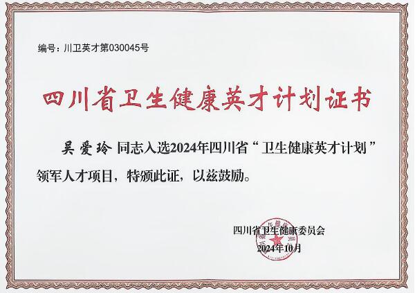 吴爱玲博士入选2024年四川省“卫生健康英才计划”领军人才,进一步加强了医院高层次人才队伍建设,对医院人才培养和学科建设起到了积极的推动作用。