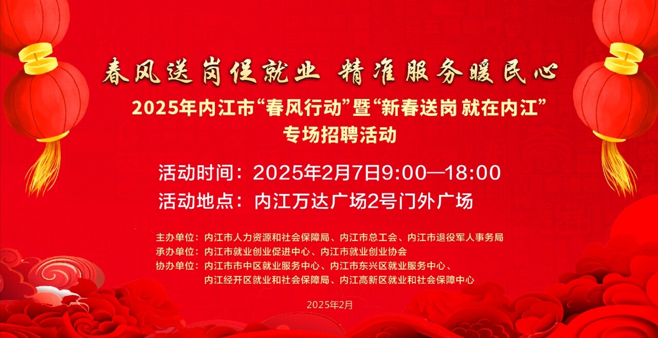 1月26日,记者从内江市就业创业促进中心了解到,2025年内江市“春风行动”暨“新春送岗 就在内江”专场招聘活动将于2月7日在内江万达广场二号门举行,活动邀请100余家企业现场招聘,提供包括养殖、制造、加工、服务外包业、交通、信息、环保、家政服务业“妈妈岗”等超8800个工作岗位,总有一个适合您。