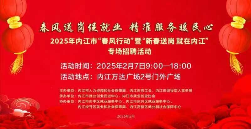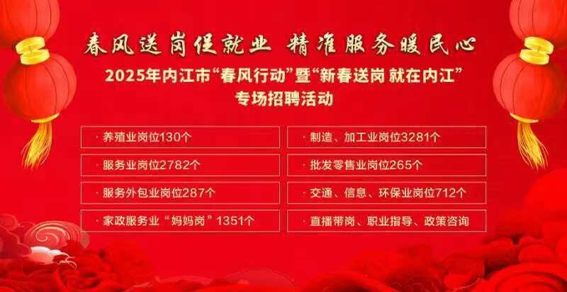 “春风送岗促就业 精准服务暖民心”。2月5日,记者从内江市就业创业促进中心了解到,2025年内江市“春风行动”暨“新春送岗 就在内江”专场招聘活动将于2月7日在内江万达广场二号门举行,活动邀请100余家企业现场招聘,提供包括养殖业、制造业、服务业、批发零售业、服务外包业、家政服务业“妈妈岗”等超8800个工作岗位。