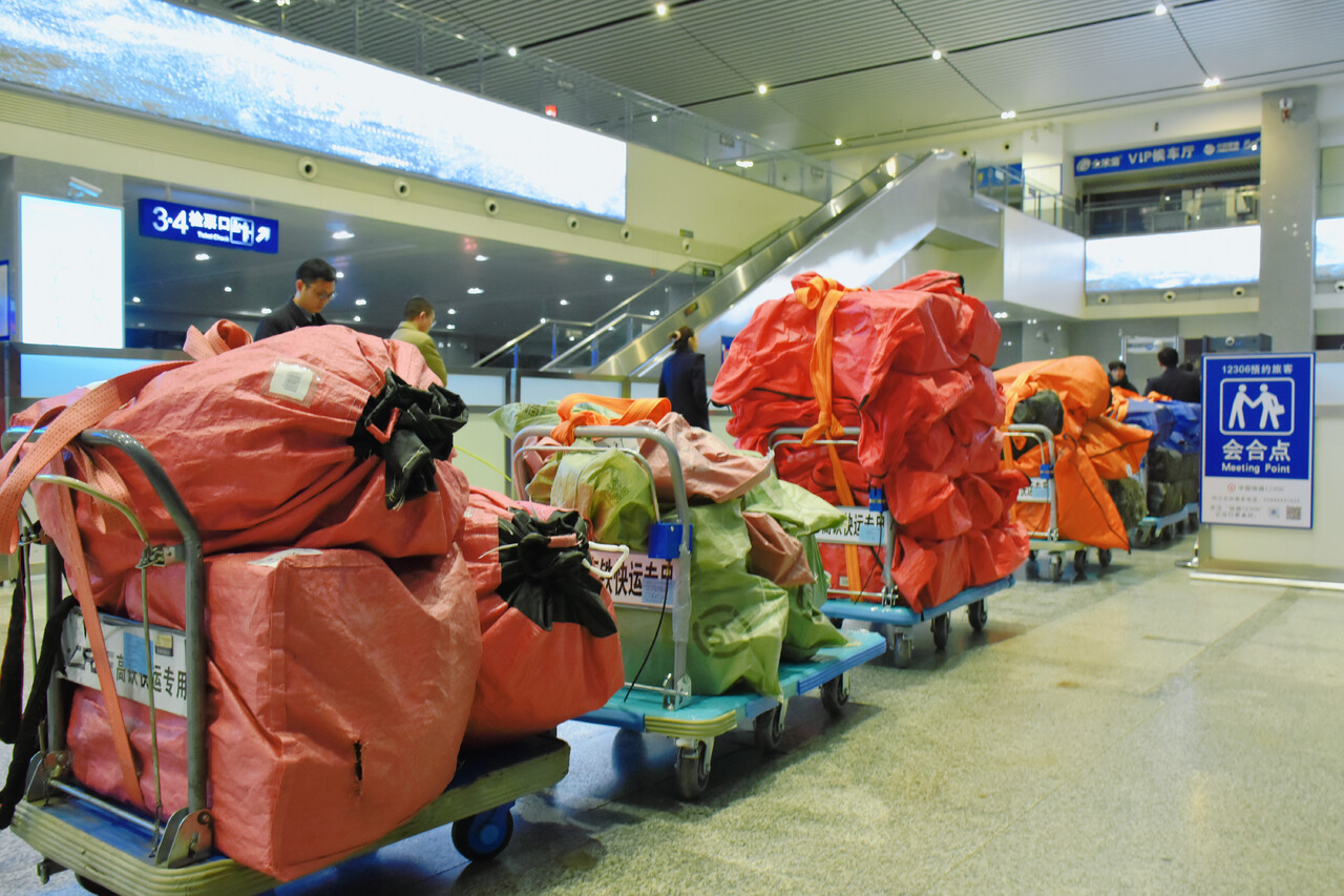 与往常不同的是,这趟列车的3号车厢里没有乘客,而是2500件、货值约50万元的快件货物。