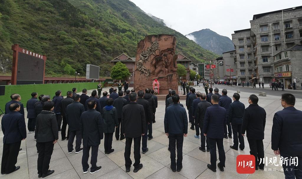 7日,全体学员首先来到红军长征翻越夹金山纪念馆广场,举行“清明祭英烈”活动。大家面向红军长征翻越夹金山纪念碑整齐列队,齐唱中华人民共和国国歌。伴随着深情的《献花曲》,武警战士抬起花篮缓缓走向纪念碑,轻轻摆放在纪念碑前。彭清华缓步走向纪念碑,仔细整理花篮缎带,驻足凝视。花篮缎带上“红军烈士永垂不朽”八个大字庄重而醒目。大家向纪念碑三鞠躬,表达对革命烈士最崇高的敬意。