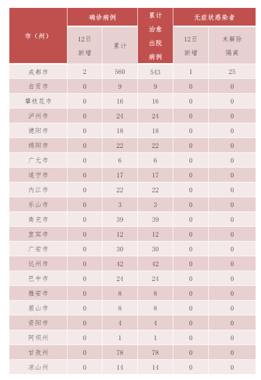 4月12日0-24时,全省新增无症状感染者1例(境外输入,4月10日自埃及乘机抵蓉,4月12日诊断为无症状感染者),当日转为确诊病例1例,当日解除集中隔离医学观察1例。尚在集中隔离医学观察25例(均为境外输入),比前一日减少1例。