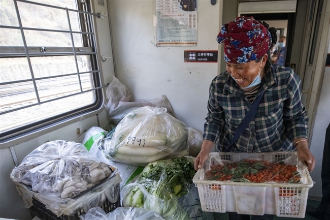 ↑在5633次列车上的“流动集市”,一名彝族妇女(左一)向其他乘客售卖新鲜的折耳根(4月11日摄)。
