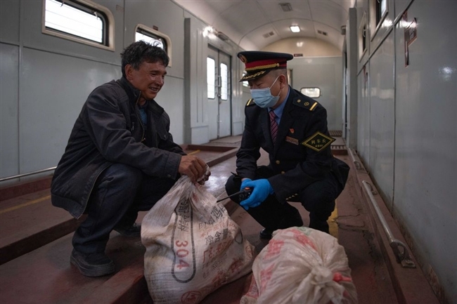 ↑在5633次列车的“行李车厢”内,中国铁路成都局集团公司成都客运段5633/5634次列车长刘伟(右)了解村民携带牲畜情况(4月11日摄)。