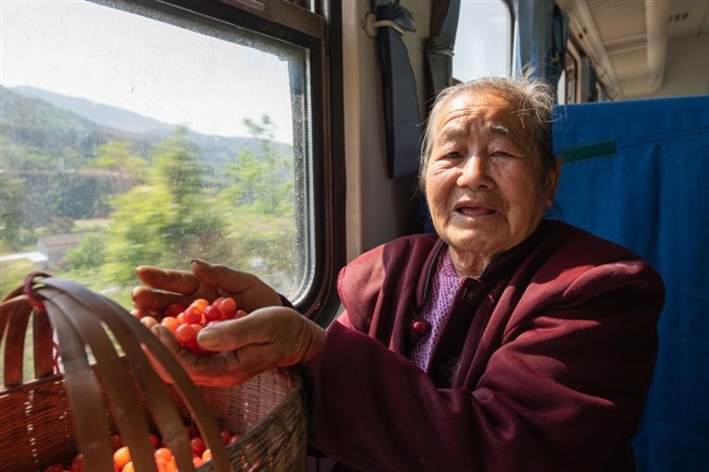 ↑冕宁县村民马光玉带着自家种的樱桃前往西昌出售,每天她都会搭乘5633/5634次列车往返西昌和冕宁(4月11日摄)。